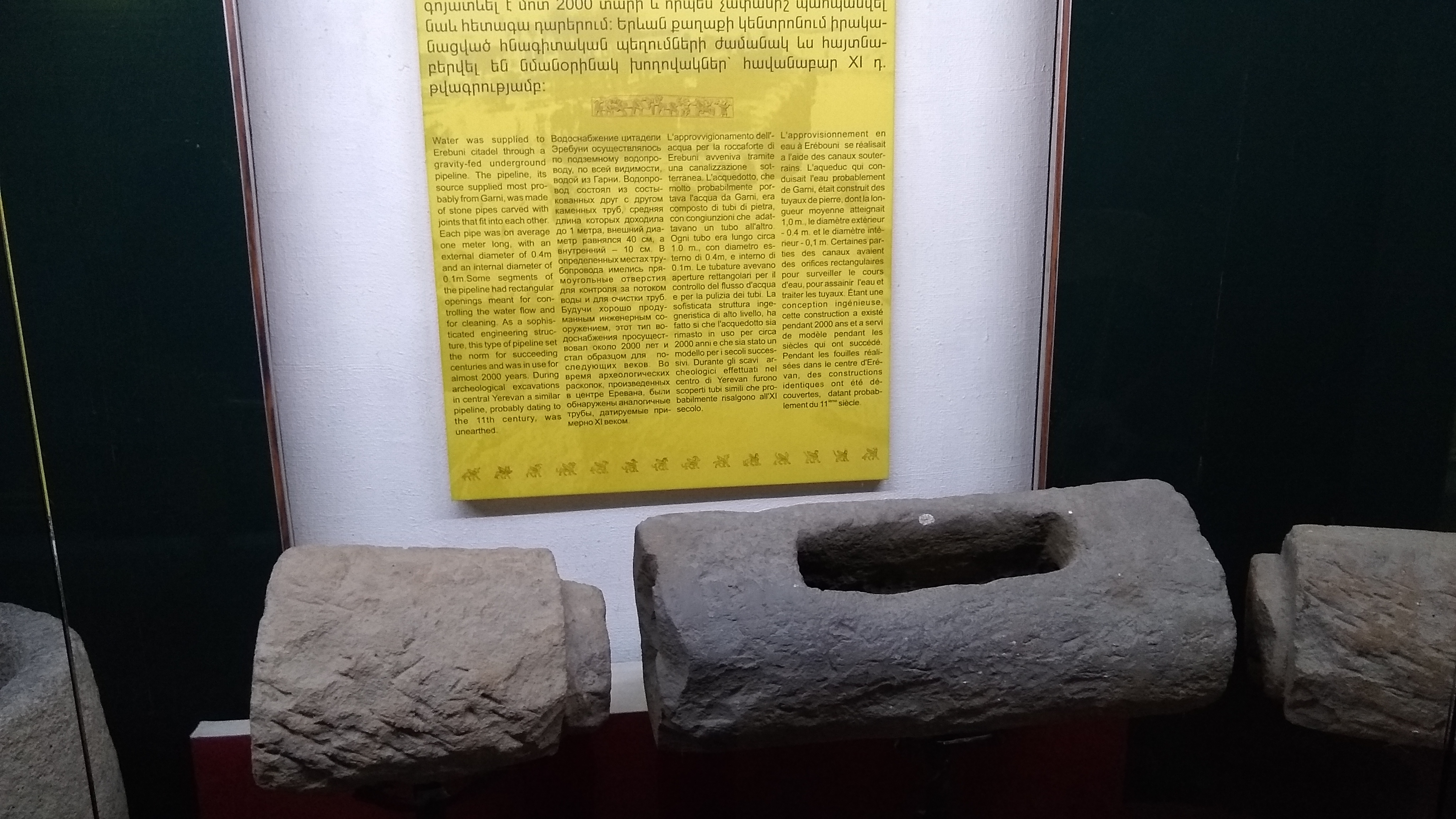 When I got to my destination and said "kangarum kangnal" (stop at the stop) at the appropriate moment, I got to the outskirts of Yerevan and the Erebuni archaeological site. Here I visited the museum and paid for a photography pass so I could take some photos. In Armenia they're a little bit reluctant to allow photography in museums and other public buildings, but the Erebuni museum allowed it but for a fee. Although I took a lot of pictures two I’d like to highlight are the ornate jewellery (Figure 6) and the water pipes (Figure 7), showing that this ancient city had both artwork and plumping, which are things we can relate to even to this day that were found in this ancient city.