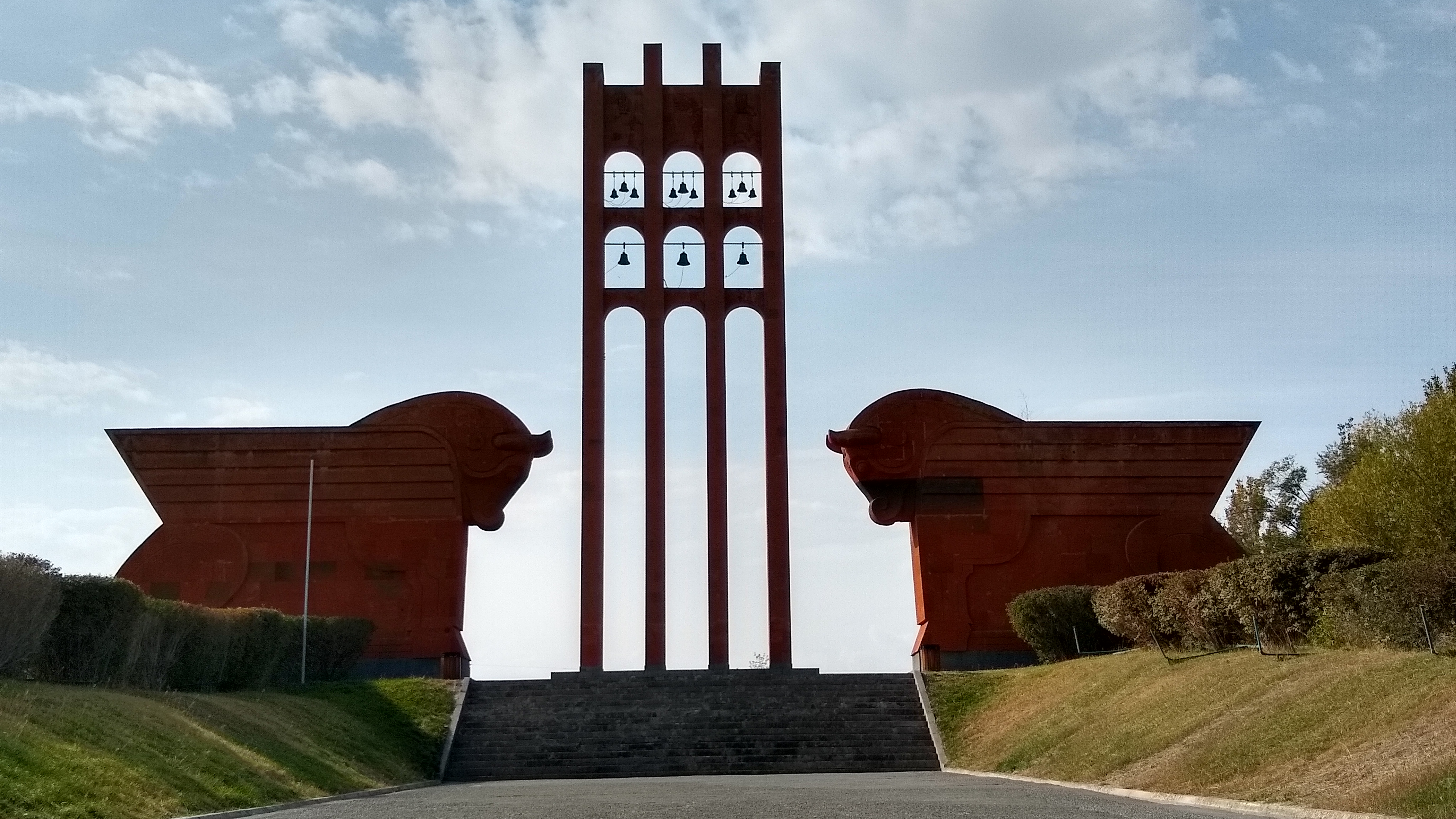 The monument consists of two bulls facing each other with a bell tower in the middle, which is in a courtyard slightly behind the bulls, but is difficult to see from the perspective of the entrance to the memorial (Figure 1). Another thing that's difficult to perceive from here is the sheer height of the monument, it is clearly visible from some distance away, but standing beneath it really makes you appreciate the size of the monument.