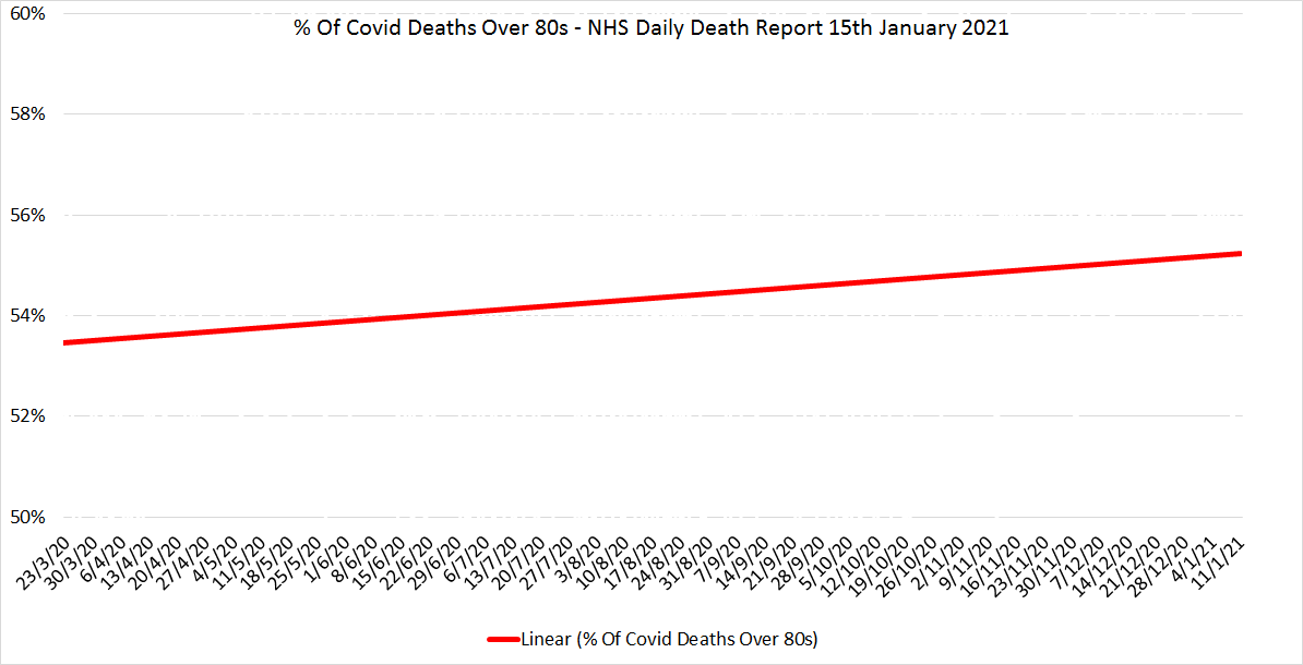 Figure 1: The original graph posted on Twitter. This graph purports to show that over the duration of the Covid-19 pandemic the proportion of people who died from covid-19 who were over 80 years of age at time of death increased. The argument goes that the lockdown measures were thus uneffective at protecting the most vulnerable in society, and therefore unnecessary and damaging.