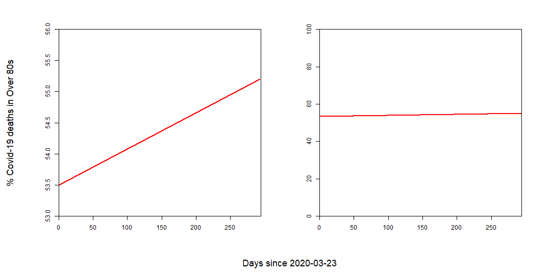 This graph (Figure 1) was used to argue that the basis of the lockdown strategy used in the UK, i.e. to minimise the spread of Covid-19 and thus protect elderly and other clinically vulnerable people, was not working. The reason being that during the course of the pandemic (and the lockdowns), the proportion of the deaths from Covid-19 that were in people over 80 had increased, so a “herd immunity and shielding” strategy would have been better according to this logic. Not only is this a flawed interpretation of the trend and its significance for government policy (the proportion of deaths in people over 80s isn’t the thing that the policy is aimed to reduce, rather it is the total number of deaths that the policy is aiming to reduce), it’s also a very bad graph. I shall demonstrate two problems with it.